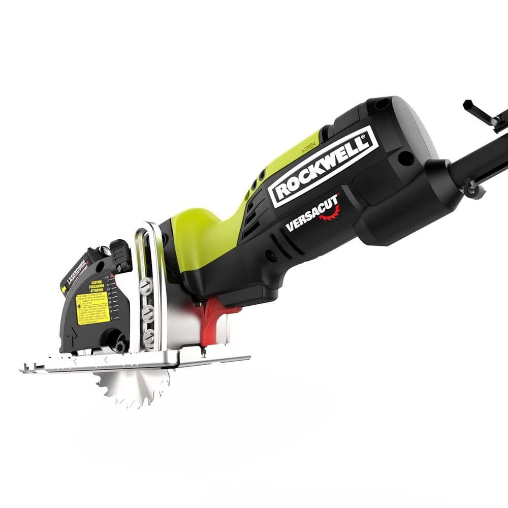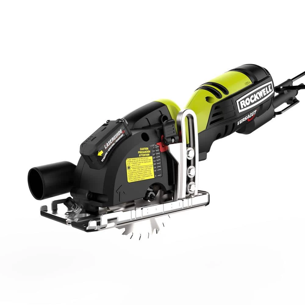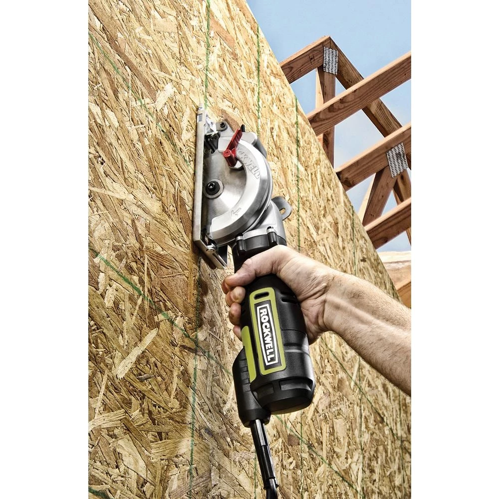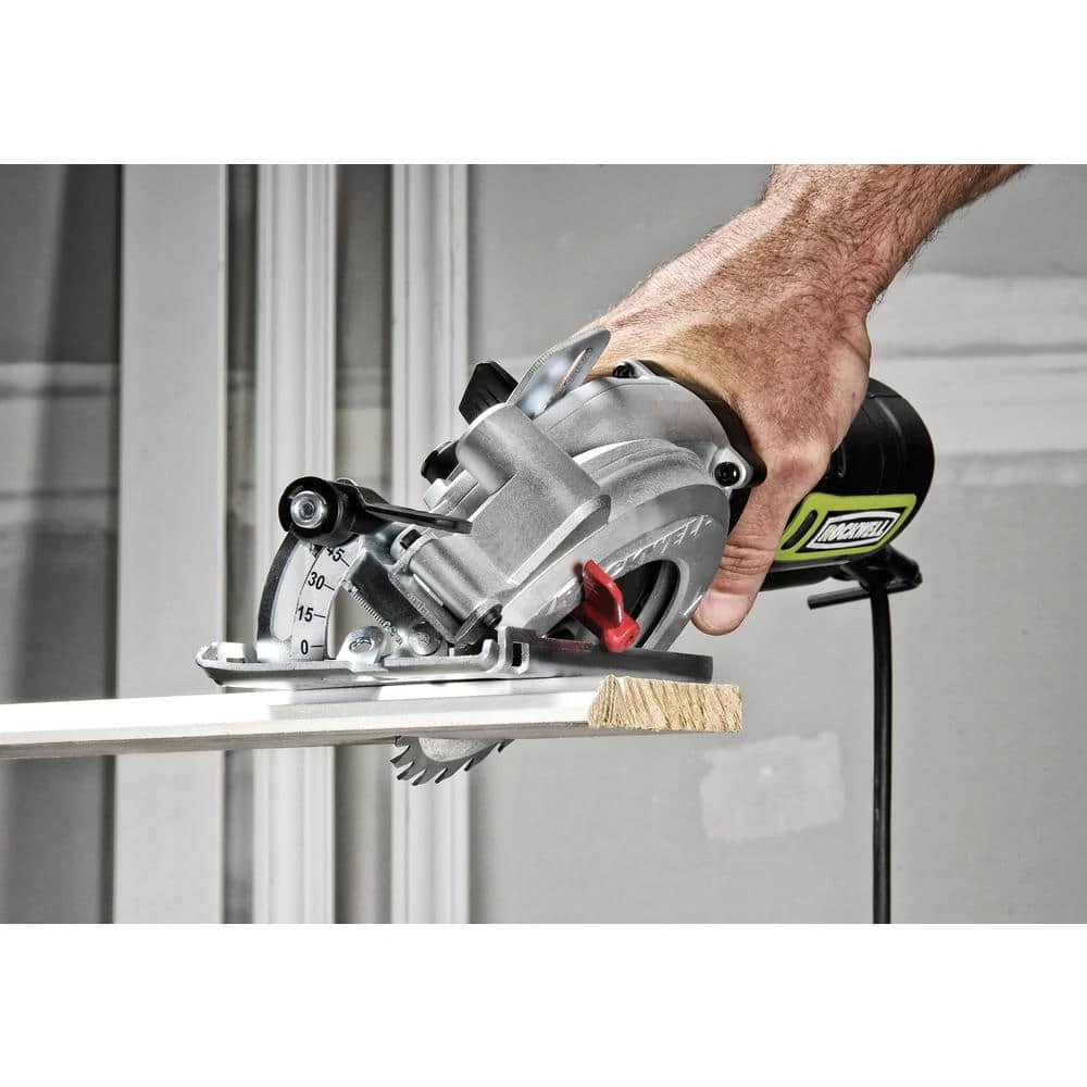 The Rockwell 4-1/2″ Compact Circular Saw is an effective and hassle-free replacement for a traditional circ saw. Just grab it and go when you need to make some quick rip or plunge cuts-no need to lug out the bulky full-size saw. Even though it has the functionality to handle all sorts of projects, this saw was made for 2″ lumber, cutting 2x4s in a single pass. Its lightweight design (only 5 lbs) allows for better control of the tool so you can operate it with just one hand. And it makes overhead cutting much more of a possibility than with a full-size saw. The grip is comfortable to use for extended periods. And the smaller blade allows the 5-amp motor to spin it up to 3,500 rpm, achieving the speeds of much larger saws while putting less strain on the motor for more efficient energy usage and increased life of the tool. The easy to access depth adjustment lever allows for a maximum cutting depth of 1.7″ at 90 degrees. While the bevel lever lets you make the most common angled cuts from 0-45 degrees, with a maximum cutting depth of 1.125″ on those cuts. Again, this saw excels at 2x4s, but is also awesome on plywood, hardwood flooring, pegboard, dowels, molding and more. Comes with one 24T TCT blade, a parallel guide, vacuum adapter, and blade key.