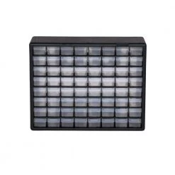 Our large frame 64 Drawer Plastic Storage Cabinet organizes and protects your hardware small parts. The strong, rugged frame is constructed of high impact polystyrene for years of use and abuse. Our unbreakable polypropylene drawers are flexible. strong, see-through and feature finger grip drawer pulls. Cabinet includes 64 dividable clear drawers, 2.25 in. width x 1.5 in. height x 5.25 in. length. A versatile storage solution for the home and garage.