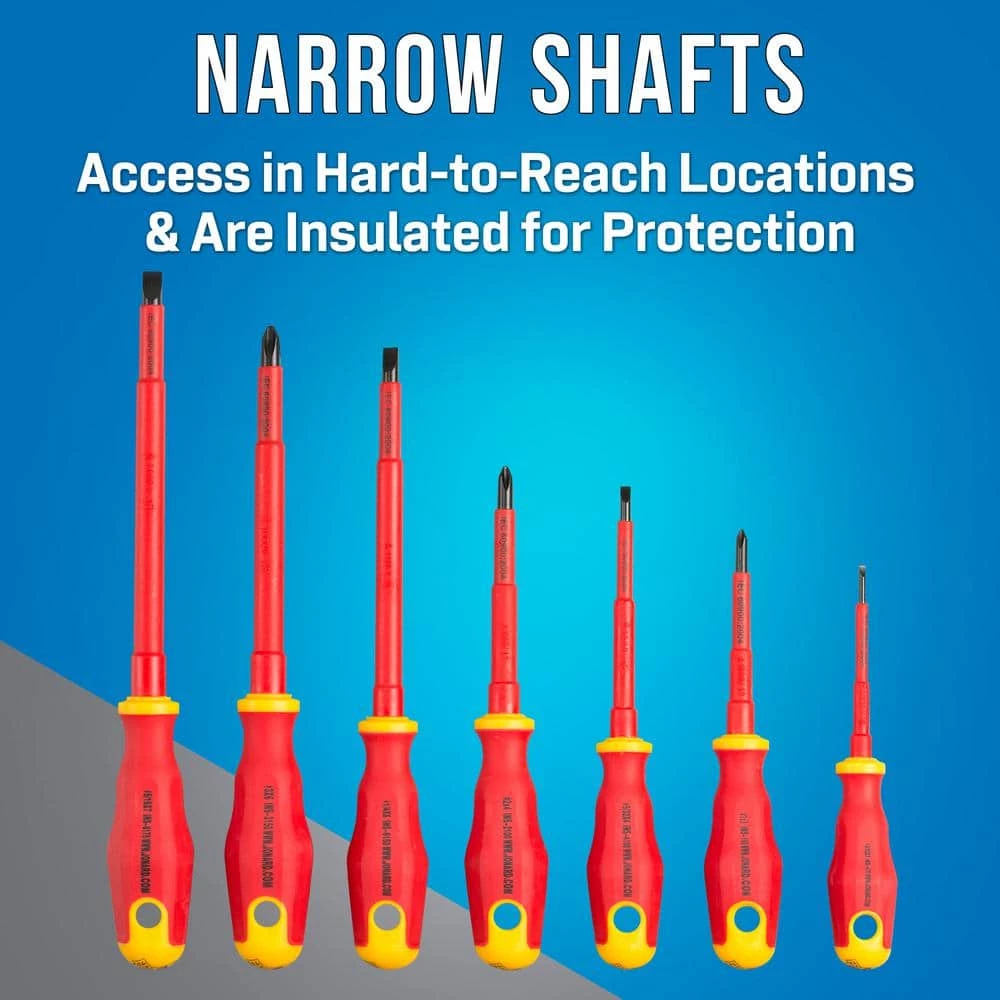 - INCLUDES: Insulated #1, #2, and #3 Phillips head screwdrivers & Insulated Slotted Screwdrivers with tip widths of 3/32″, 5/32″, 1/4″, & 5/16″