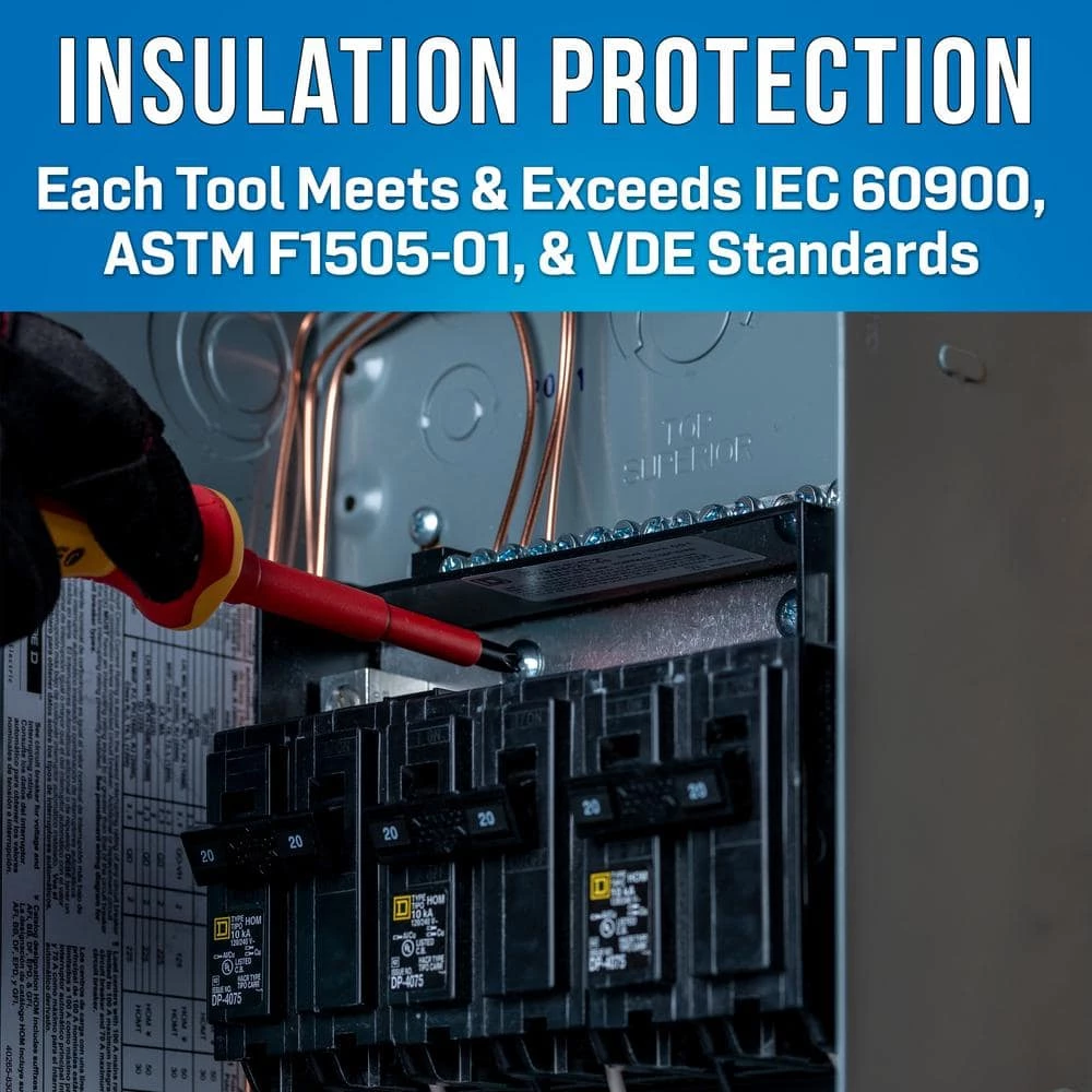 - INSULATION PROTECTION: Each tool meets and exceeds IEC 60900, ASTM F1505-01, and VDE standards for high voltage protection. Tested to 10,000 VAC and rated to 1,000 VAC live use