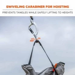 - Swiveling carabiner for hoisting – double-action carabiner with captive eye prevents tangles and enables safe lifting to heights