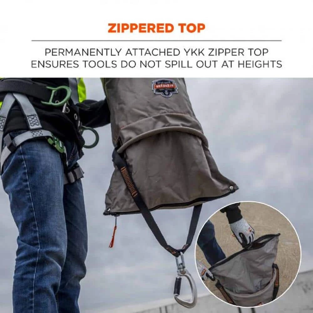 The Arsenal 5974 Large Nylon Hoist Bucket Tool Bag is certified to the ANSI/ISEA 121-2018 dropped object prevention standard for safely hoisting, storing and accessing tools while working at heights. Made primarily of 1200D nylon-plus an 840D nylon top, synthetic leather bottom and heavy-duty YKK zipper closure-this hoist bucket is built for long-lasting durability. Unlike other tool buckets, it includes a built-in zippered top for ensuring tools do not spill out when at heights. In addition to the zippered closure, the top ring of the bucket is molded to maintain a wide opening for easy viewing and access to tools. An interior pocket is also included for tool organization. The high-tensile webbing handle is reinforced with leather and tarpaulin. This tool bucket is hoisted via a double action swiveling carabiner. The swiveling mechanism prevents tangling by enabling seamless rotation of the bucket and the carabiner’s captive-eye prevents the webbing from working its way into the gate of the carabiner and opening while in use.