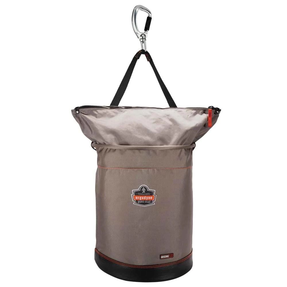 The Arsenal 5976 XL Nylon Hoist Bucket Tool Bag is certified to the ANSI/ISEA 121-2018 dropped object prevention standard for safely hoisting, storing and accessing tools while working at heights. Made primarily of 1200D nylon-plus an 840D nylon top, synthetic leather bottom and heavy-duty YKK zipper closure-this hoist bucket is built for long-lasting durability. Unlike other tool buckets, it includes a built-in zippered top for ensuring tools do not spill out when at heights. In addition to the zippered closure, the top ring of the bucket is molded to maintain a wide opening for easy viewing and access to tools. An interior pocket is also included for tool organization. The high-tensile webbing handle is reinforced with leather and tarpaulin. This tool bucket is hoisted via a double action swiveling carabiner. The swiveling mechanism prevents tangling by enabling seamless rotation of the bucket and the carabiner’s captive-eye prevents the webbing from working its way into the gate of the carabiner and opening while in use.