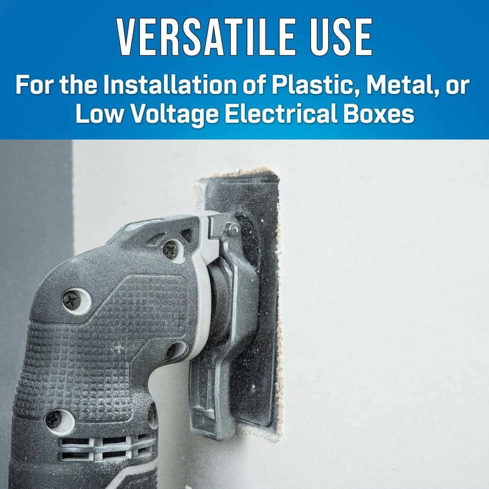 Featuring our EBC-400 Single Gang Electrical Wall Box Cutter and our WTL-12 Wall Template and Level, the EBW-412 is the essential kit for installing single gang electrical wall boxes. This kit features the following: – WTL-12 has built-in levels and a rubber backing to allow you to position the template exactly where you need it. – WTL-12 is compatible with: Carlon B114R and B12R single gang boxes, Carlon B225R double gang boxes, Carlon SC100RR low-Voltage plates, Arlington Industries LVL1 and LVL2 boxes, and many other brands of non-metallic single and double gang boxes. – When used with a multitool, EBC-400 cuts drywall in just-seconds to make installation of electrical boxes quick and easy. – Can be used for installation of plastic, metal, or low-Voltage existing construction electrical boxes (2 3/8 in. x 3 3/4 in. ). – Needs to be used with an oscillating multi-tool (sold separately), and fits most industry-standard multi-tool power tools.