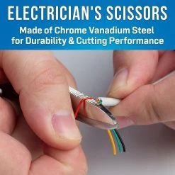- Electrician’s scissors: designed for heavy duty use with built-in wire stripping notches and made of chrome vanadium steel with nickel plating for high durability and long life