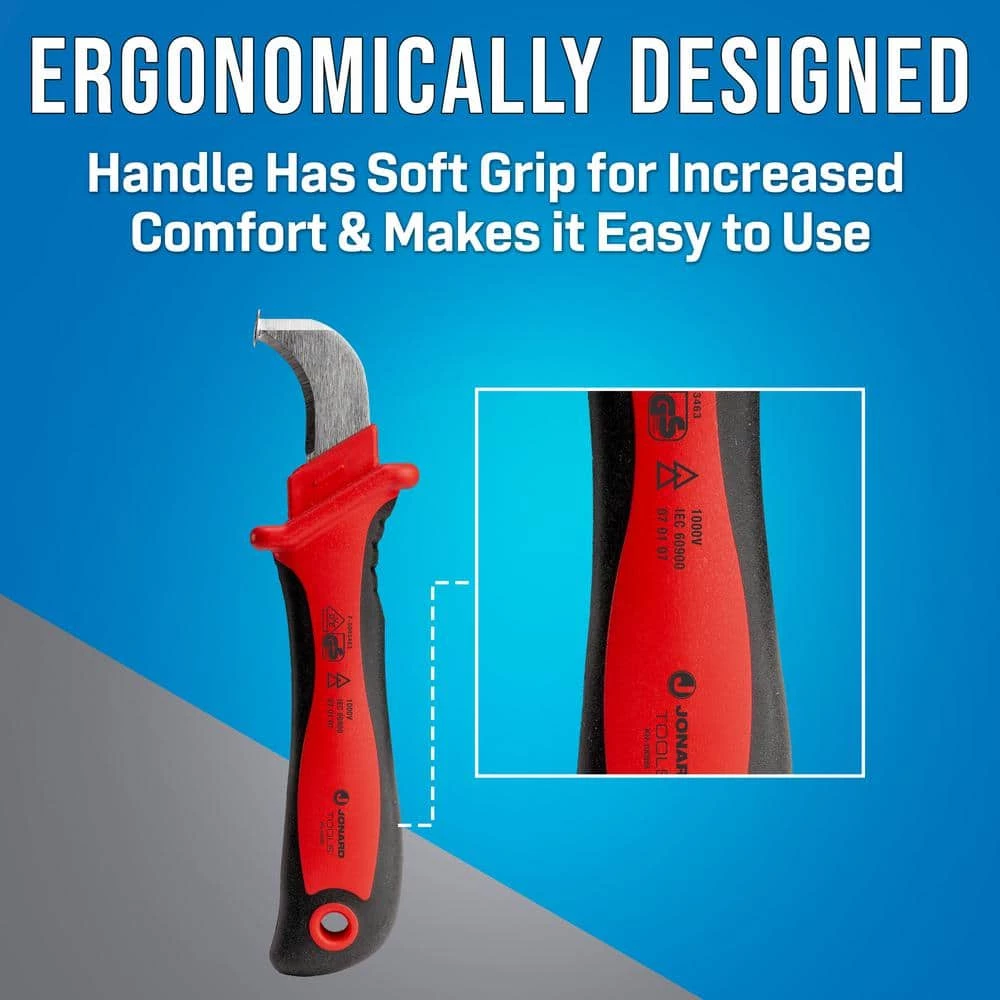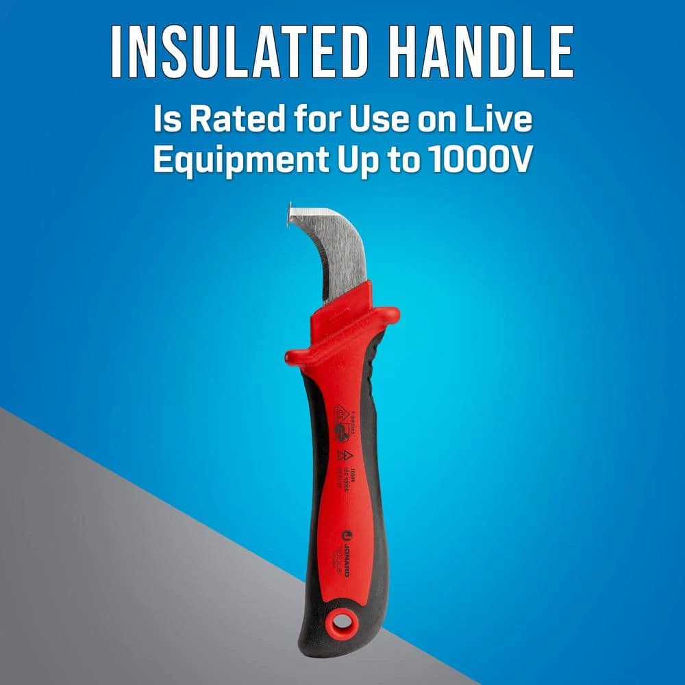 Designed with a curved blade and insulated handle, this cable dismantling knife is the perfect tool for slitting or cutting the sheathing off of cables without damaging the conductor insulation inside. This cable dismantling knife also features the following: Dual component insulated handle is rated for use on live equipment up to 1000V and is compliant with DIN EN 60900 (VDE 0682-201):2013-04 standards. Ergonomically designed stainless steel curved blade and soft grip make it comfortable and easy to slit and cut sheathing off cables. Guide shoe on knife tip prevents center conductor insulation from being damaged. Included safety cap and tethering hole make storage convenient.