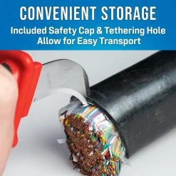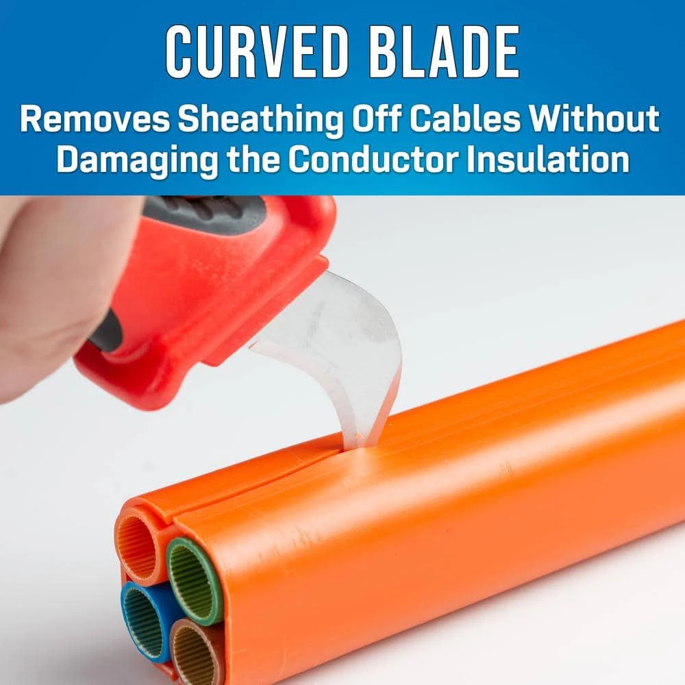 - Curved blade: push or pull to remove sheathing off cables without damaging the conductor insulation inside