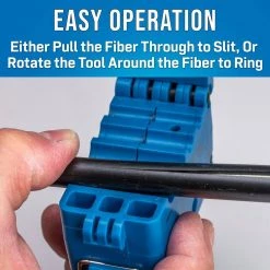 - Easy operation: simply open the tool, place the fiber in the proper groove, lock the tool, and either pull the fiber through to slit, or rotate the tool around the fiber to ring