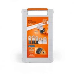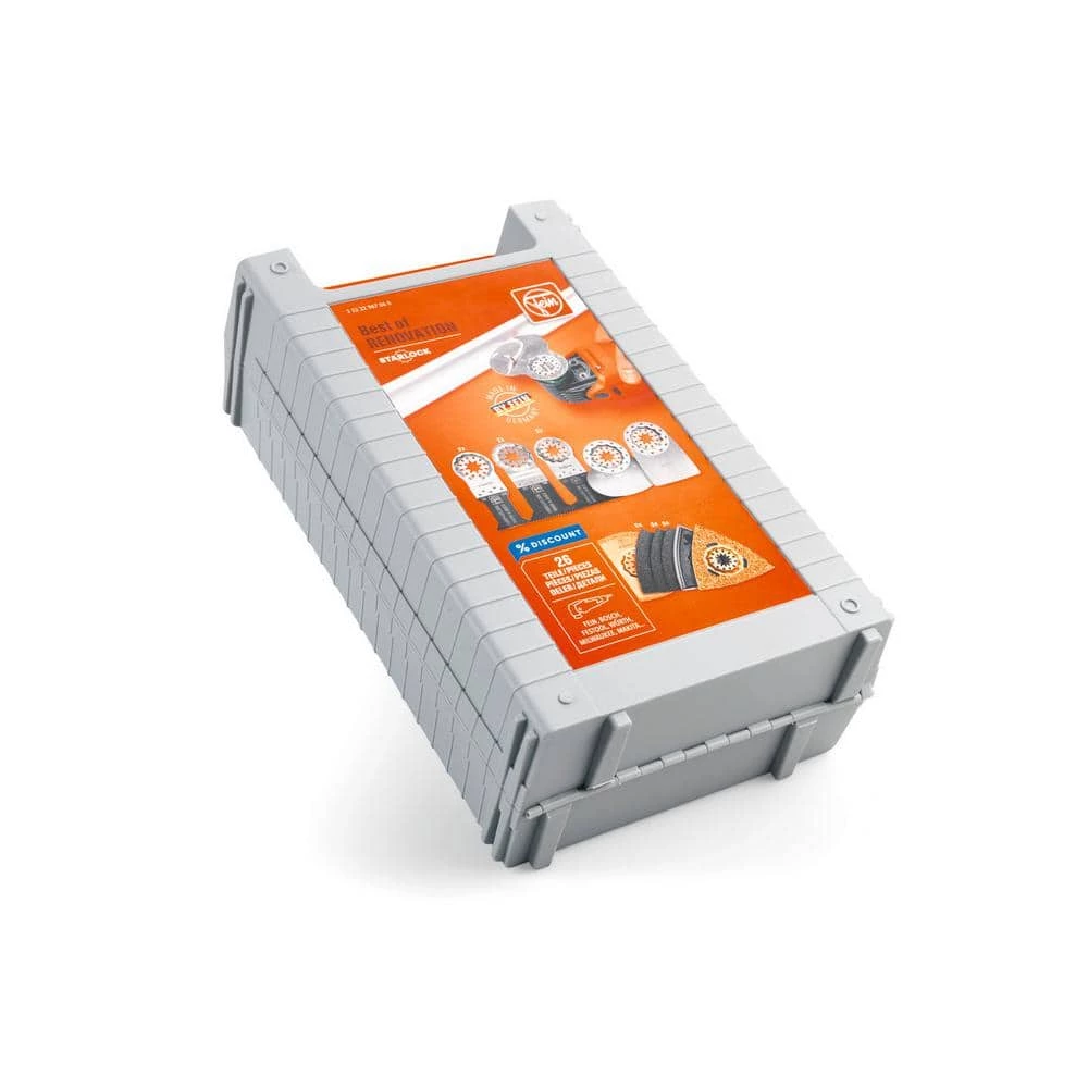 26-piece accessory set for all your renovation work. Suitable for all FEIN Multi-tools and all other commercially available multi-tools with the Starlock mount. As a set, attractive savings compared to individual purchase. Contents: 6 E-Cut Long Life saw blades 2-pieces each 2 in. (50 mm) x 1-3/8 in. (35 mm), 2 in. (50 mm) x 2 in. (50 mm), 2 in. (50 mm)x 2-9/16 in. (65 mm), 1 carbide rasp 3-1/8 in. (80 mm), 1 carbide segment saw blade, Dia 3 in. (75 mm), 3/32 in. (2.2 mm), 1 rigid scraper, 1 mushroom-shaped cutter blade, 1 sanding pad, unperforated 3-1/8 in. (80 mm), 15 sanding sheets (5 each of grits 60, 80, 120).