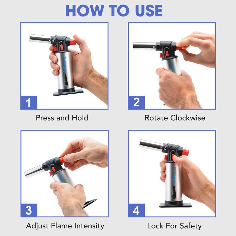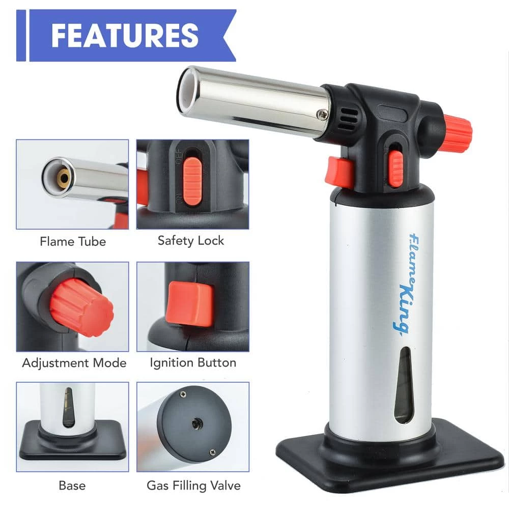 The Flame King YSNAX1-207 Professional Butane Kitchen and Culinary Torch is highly versatile and allows you to create amazing dishes at home that were only available at restaurants-from cre`me brulee to indoor s’mores for the kids. Plus, it’s perfect for soldering and DIY house projects. With its adjustable flame you now will be able to get that Michelin-Star level of sear on meats, brown brulees, roast peppers, chicken filets or any main course and desert you wish. Now let your creativity run free and happy torching.