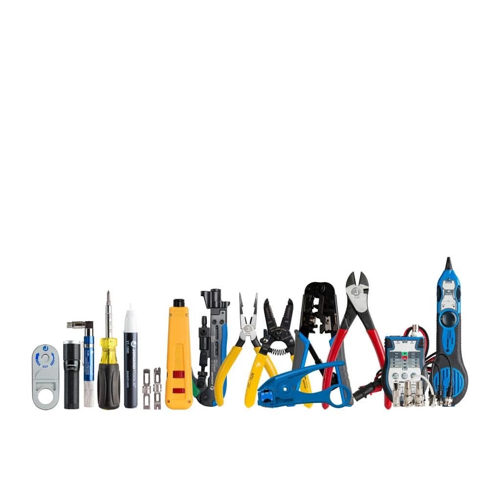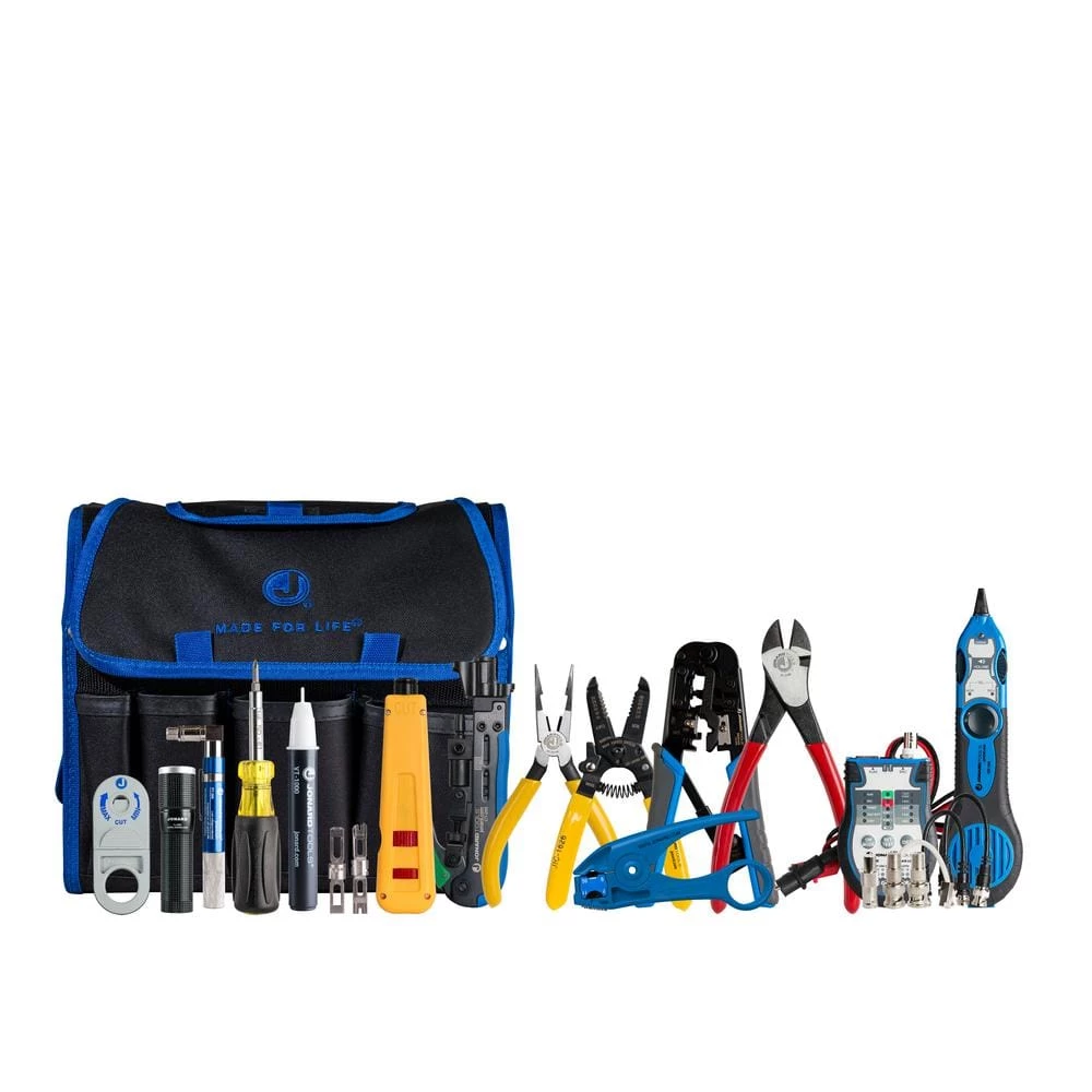 - Kit includes: SD-61 screwdriver multi-bit 6-in-1, FL-2000 LED flashlight with zoom lens, PT-300 pocket continuity tester and toner, JIC-2288 high leverage diagonal cutting pliers, 8 in. JIC-22148 combo crimper long nose pliers, TETP-900 multi-function cable tester tone and probe kit, CT-200 universal compression tool, UC-864 modular crimping tool 6-in-1, CST-1i cyclops wire stripper, JIC-1626 wire stripper 16-26 AWG, EPD-91461 punchdown tool with 2 blades 66 and 110, VT-1000 voltage detector, UST-125 COAX stripping tool for RG59 RG6 RG7 RG11 with cable stop, H-90 rugged 21 pocket tool case