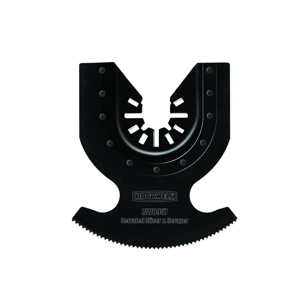 The Rockwell RW8957 Serrated Slicer and Scraper blade. Use this versatile blade for a variety of applications. Slice soft materials such as carpet, foam insulation panels, roofing shingles and cardboard. Scrape and remove old paint, coatings, residues, and hardened adhesives. The Universal Fit interface fits all oscillating tools.