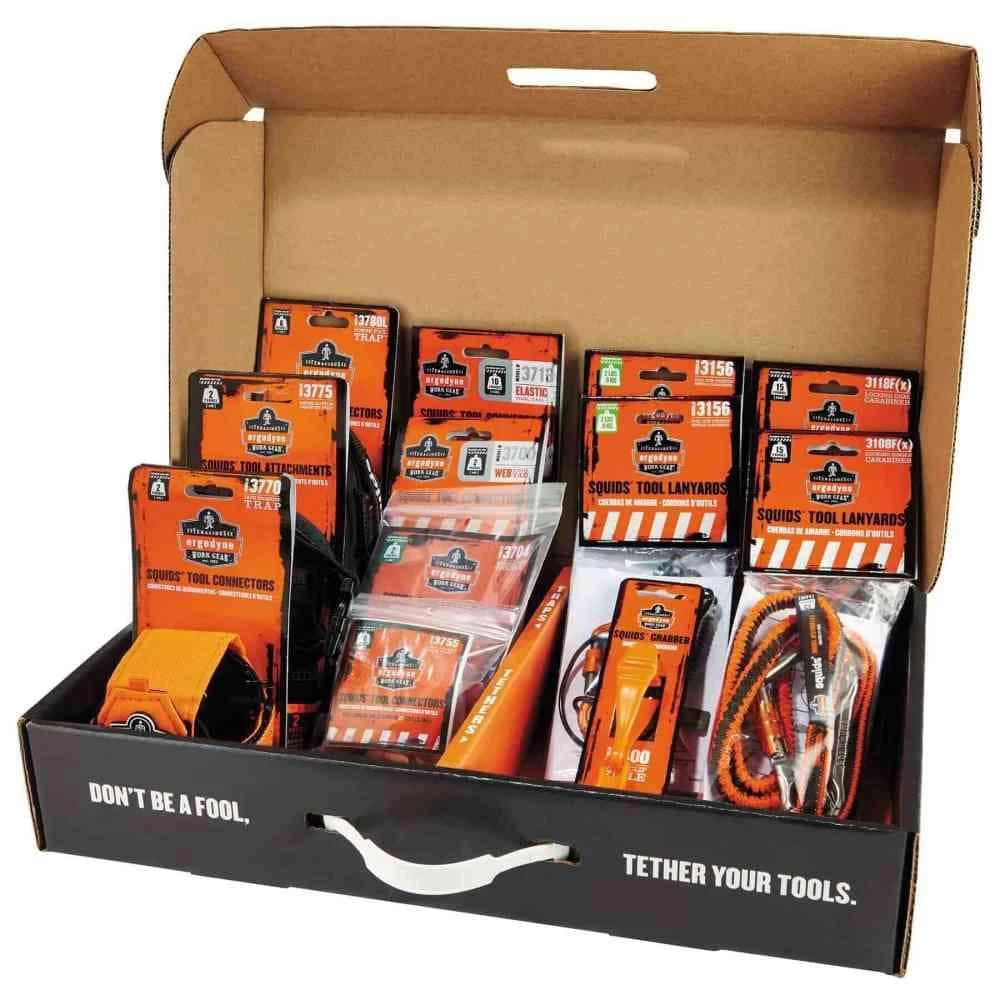 The Squids 3185 Glazier Tool Tethering Kit contains tool attachment and tool lanyard solutions specific to tools commonly used by glaziers working at heights. The kit contains product solutions for tethering flat bars, tape measures, pliers, cordless impact drills/drivers, utility knives, spray bottles, caulking and putty knives, gloves and hard hats. The tool attachment solutions in this kit include a tape measure holder, power tool holder, water bottle holder and a variety of Tool Tail attachments (wire, elastic and webbing). These solutions create quick and easy attachment points for tool lanyards. The kit also includes several tool lanyard styles (coil, shock-absorbing, single and dual carabiners) with various weight ratings ranging up to 15 lbs. /6.8 kg to accommodate different tools and attachment/anchor points. The kit also includes self-adhering tape that requires no heat source for application and a glove grabber to keep your gloves, rags or other small accessories close at hand. The tape is meant to be used with the web and elastic Tool Tails that come with each kit.