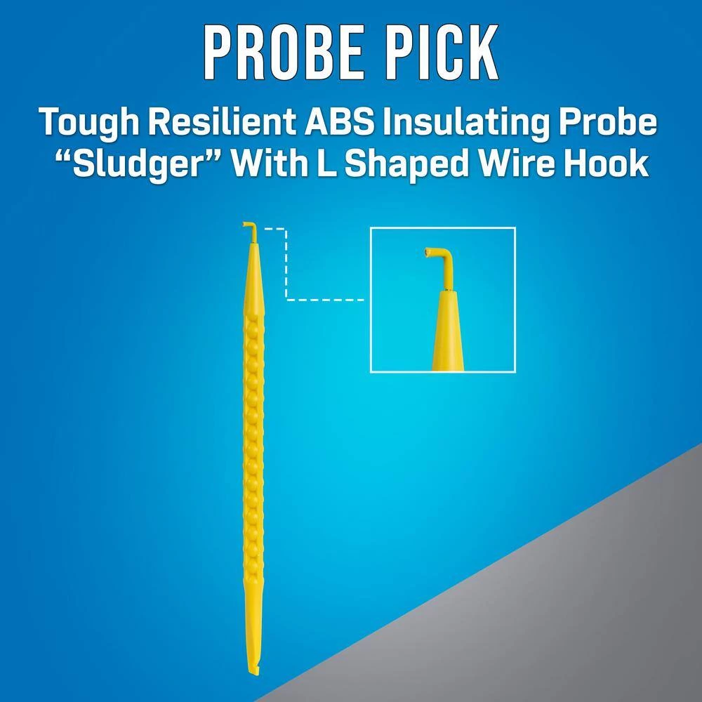 - Probe pick: tough resilient abs insulating probe spudger in. with l shaped wire hook extension on one side and flat notched end on other side, used in electrical contacts tool pouch: made from rugged PVC material for long life with metal clip and has 5 form fitted pockets to fit all the tools in this tool kit as well as other tools